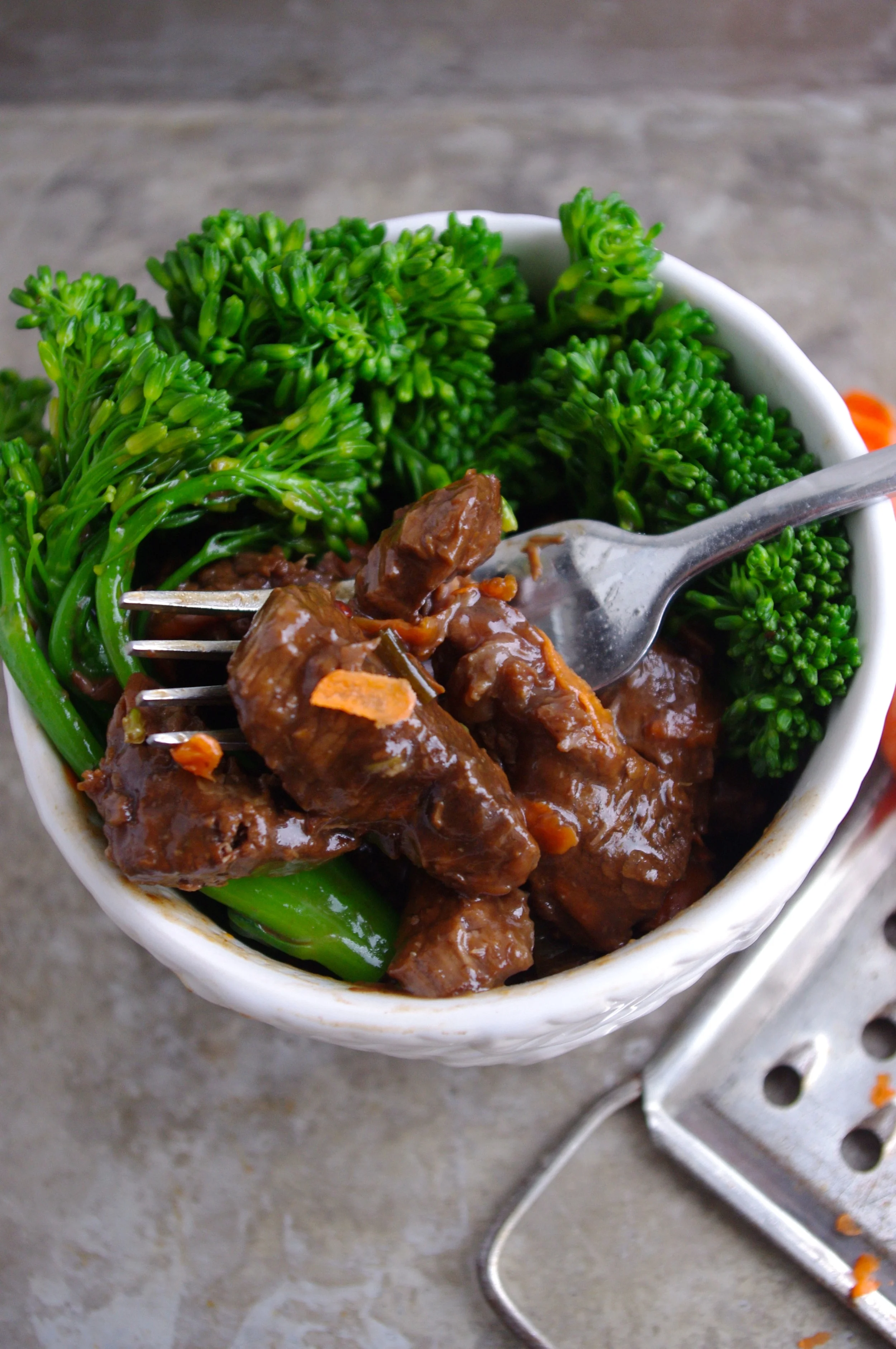This Mongolian Beef will make your house smell delicious as it’s cooking away in the slow cooker, and the beef becomes so tender it almost melts in your mouth, seriously! Combined with some brown basmati rice or quinoa, and a side of steamed broccolini (or your favorite vegetables of choice) this dish makes a perfectly balanced meal to enjoy in a cozy sweater on the couch, curled up with your Tablet and the latest issue of Gorgo. ;)